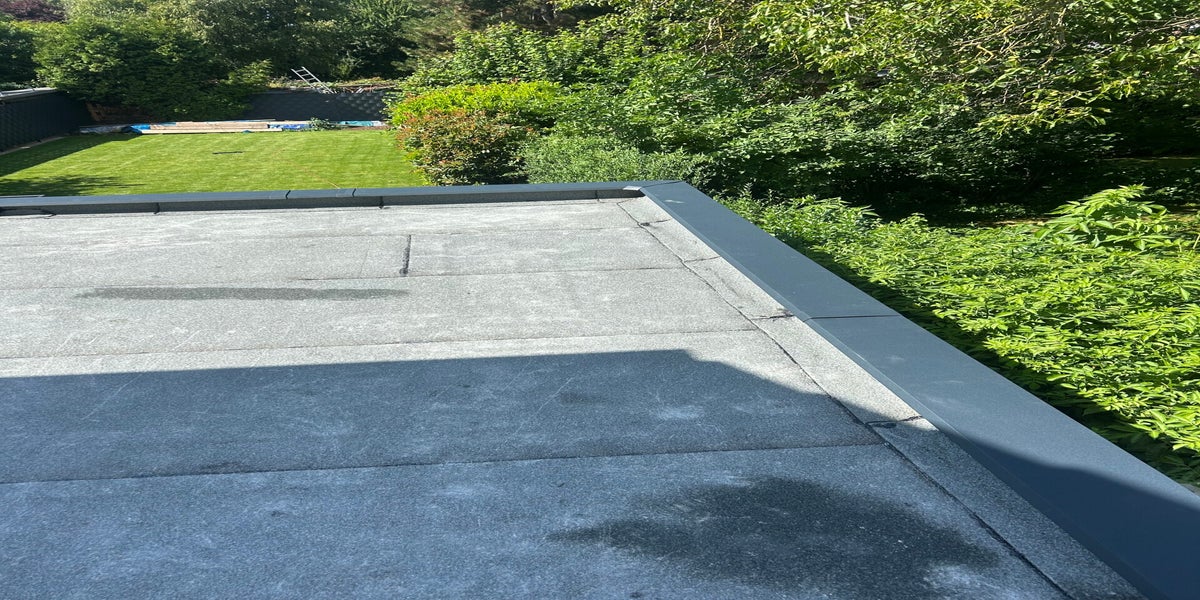 Darauf folgte ein zweilagiger Bitumenaufbau, bestehend aus einer hochwertigen Bitumen-Oberlage der Firma Bauder. Zusätzlich wurde das Dach mit einem Attika-Blech von Prefa in elegantem Schwarz versehen.
