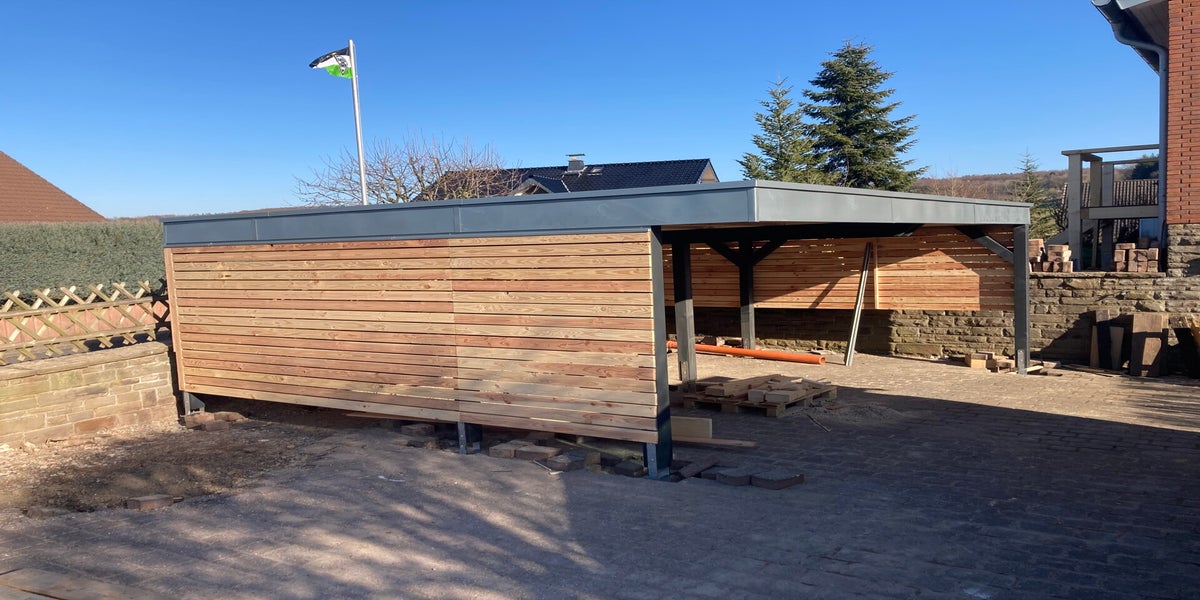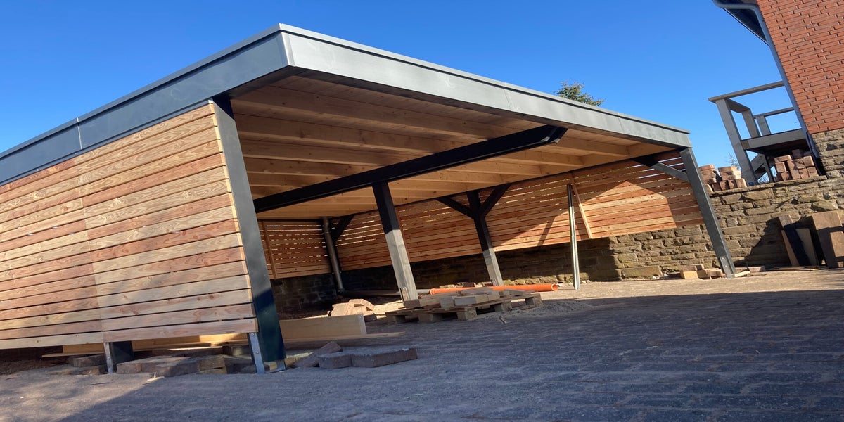 Für einen Kunden haben wir ein hochwertiges Carport errichtet, das durch seine besondere Bauweise überzeugt. Die Konstruktion wurde mit Douglasien-Brettern umgesetzt, die in einer teils geschlossenen Ausführung angebracht wurden.